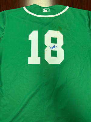 This jersey was signed and worn by pitcher, #18 Lucas Wepf during the Tulsa Drillers Go Green Night on Thursday, April 17th 2025 at ONEOK Field. This jersey is a size 46 and proceeds will help support the Friends of the Tulsa Metropolitan Environmental Trust (The Tulsa M.e.t.).