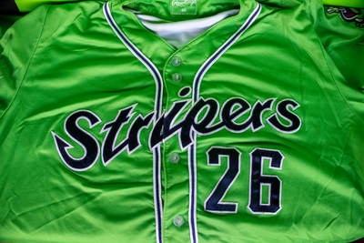 Game-worn green Stripers jersey with navy and white trim. Shows light evidence of on-field action. Perfect for fans and collectors!