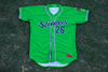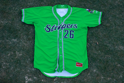Game-worn green Stripers jersey with navy and white trim. Shows light evidence of on-field action. Perfect for fans and collectors!
