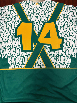 This jersey was unassigned during the Tulsa Drillers Chicken Dancers Nights from Thursday, May 15th to Sunday, May 18th 2025 at ONEOK Field. This jersey is #14 and is a size 46 and proceeds will help support the Tulsa Drillers Foundation.