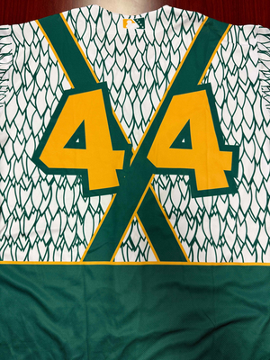 This jersey was unassigned during the Tulsa Drillers Chicken Dancers Nights from Thursday, May 15th to Sunday, May 18th 2025 at ONEOK Field. This jersey is #44 and is a size 50 and proceeds will help support the Tulsa Drillers Foundation.
