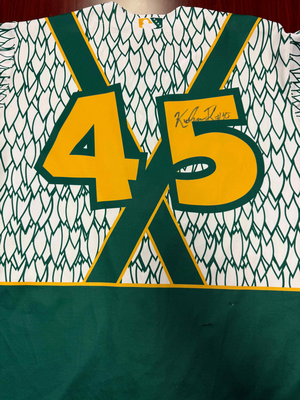 This jersey was signed and worn by pitcher, #45 Kelvin Ramirez during the Tulsa Drillers Chicken Dancers Nights from Thursday, May 15th to Sunday, May 18th 2025 at ONEOK Field. This jersey is a size 50 and proceeds will help support the Tulsa Drillers Foundation.