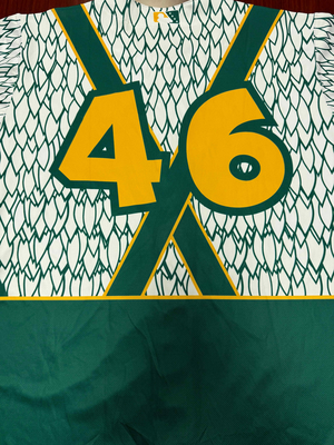 This jersey was unassigned during the Tulsa Drillers Chicken Dancers Nights from Thursday, May 15th to Sunday, May 18th 2025 at ONEOK Field. This jersey is #46 and is a size 52 and proceeds will help support the Tulsa Drillers Foundation.