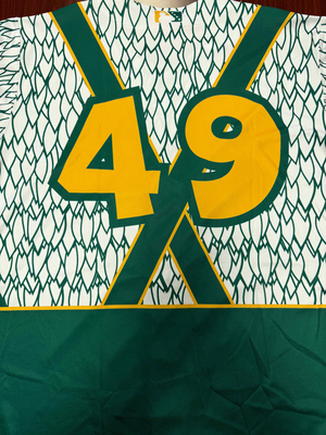 This jersey was unassigned during the Tulsa Drillers Chicken Dancers Nights from Thursday, May 15th to Sunday, May 18th 2025 at ONEOK Field. This jersey is #49 and is a size 50 and proceeds will help support the Tulsa Drillers Foundation.