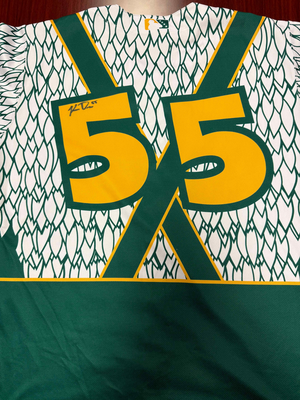 This jersey was signed and worn by coach, #55 Kupono Decker during the Tulsa Drillers Chicken Dancers Nights from Thursday, May 15th to Sunday, May 18th 2025 at ONEOK Field. This jersey is a size 48 and proceeds will help support the Tulsa Drillers Foundation.