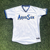 Worn by AquaSox pitcher #4 Robert Perez Jr. on 8/19-8/21/22. Size 44. Jersey will be washed, autographed, and available for pickup/shipping on 8/24/22