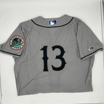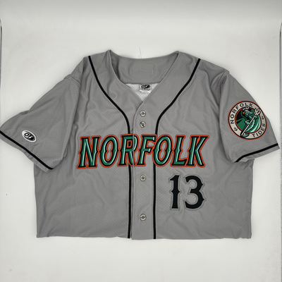 Authentic 2025 Norfolk Tides Gray Road Jersey #13 Size 46 Game Worn by Heston Kjerstad