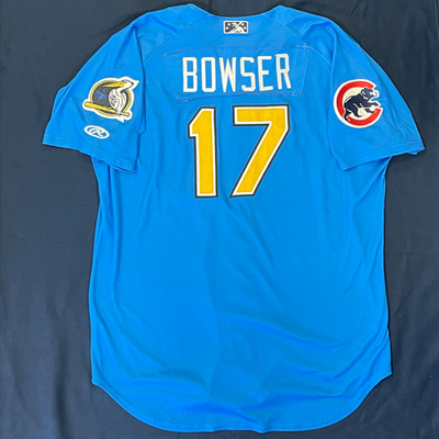 Myrtle Beach Pelicans 2019-2024 Alternate Blue #17 Size 48 Game Worn Jersey worn by Brian Glowicki/Chad Hockin (2019), Carlos Ocampo (2021), Tyler Santana (2022), Andy Garriola (2023), David Avitia/Drew Bowser (2024). Email dbailey@myrtlebeachpelicans.com to request player nameplate to be sent with jersey.