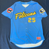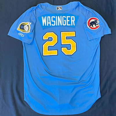 Myrtle Beach Pelicans 2019-2024 Alternate Blue #25 Size 48 Game Worn Jersey worn by Kevonte Mitchell (2019), Jordan Nwogu (2021), Peter Matt/Reivaj Garcia/Yovanny Cabrera (2022), Christian Franklin/Didier Vargas/David Avitia (2023), Daniel Wasinger (2024). Email dbailey@myrtlebeachpelicans.com to request player nameplate to be sent with jersey.