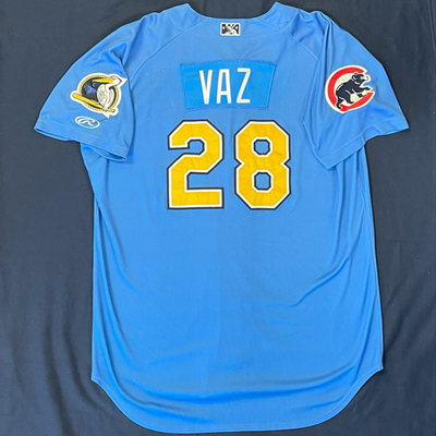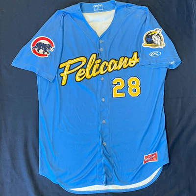 Myrtle Beach Pelicans 2019-2024 Alternate Blue #28 Size 48 Game Worn Jersey worn by Garrett Kelly (2019), Dan Puente (2021), Walker Powell/Tanner Jesson-Dalton/Andrickson Salvador (2022), Roberto Vaz, (2023), Roberto Vaz (2024). Email dbailey@myrtlebeachpelicans.com to request player nameplate to be sent with jersey.