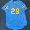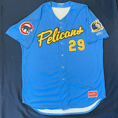 Myrtle Beach Pelicans 2019-2024 Alternate Blue #29 Size 50 Game Worn Jersey worn by Ben Hecht (2019), Tyler Suellentrop (2021), Saul Gonzalez (2022), Jordan Holloway/Stephen Gonsalves (2023). Email dbailey@myrtlebeachpelicans.com to request player nameplate to be sent with jersey.