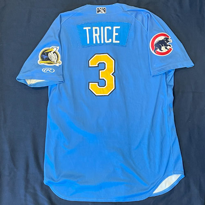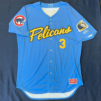 Myrtle Beach Pelicans 2019-2024 Alternate Blue #3 Size 46 Game Worn Jersey worn by Jesus Carmargo (2019), Scott Kobos/Jeremiah Estrada(2021), Reginald Preciado (2022), Corey Ray (2023), Leonel Espinoza (2024). Email dbailey@myrtlebeachpelicans.com to request player nameplate to be sent with jersey.