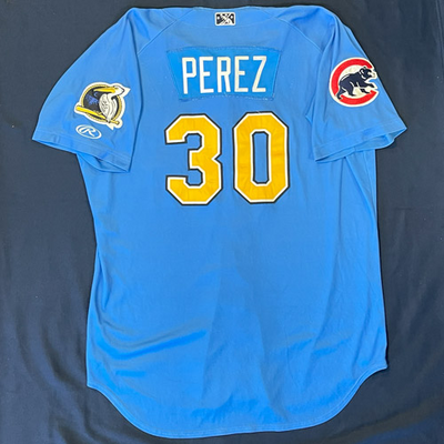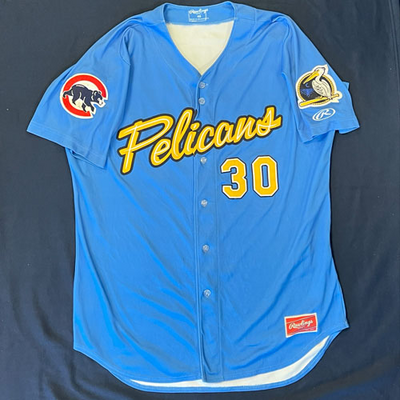 Myrtle Beach Pelicans 2019-2024 Alternate Blue #30 Size 48 Game Worn Jersey worn by Javier Assad (2019), Manuel Espinoza (2021), Riley Martin/Sam Thoresen (2022), Brady McCullough/Garrett Brown (2023), Kenyi Perez (2023). Email dbailey@myrtlebeachpelicans.com to request player nameplate to be sent with jersey.