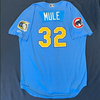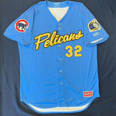 Myrtle Beach Pelicans 2019-2024 Alternate Blue #32 Size 48 Game Worn Jersey worn by Paul Richan/Zac Taylor (2019), Clayton Mortensen (2021), Clayton Mortensen (2022), Drew Gray (2023), Dominic Hambley (2024). Email dbailey@myrtlebeachpelicans.com to request player nameplate to be sent with jersey.