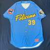 Myrtle Beach Pelicans 2019-2024 Alternate Blue #39 Size 46 Game Worn Jersey worn by Steve Lerud (2019), Felmin Bautista/Miguel Fabrizio (2021), Pete Crow-Armstrong/Frank Hernandez/Parker Chavers (2022), Christian Morel/Ismael Mena (2023), Alfredo Romero/Dilan Garandillo. Email dbailey@myrtlebeachpelicans.com to request player nameplate to be sent with jersey.