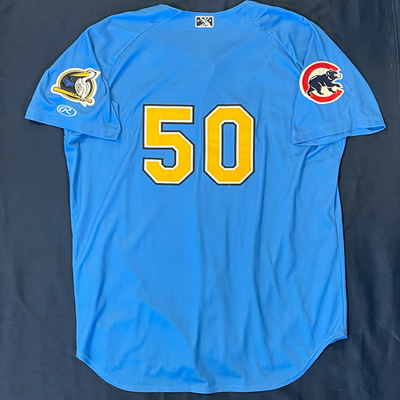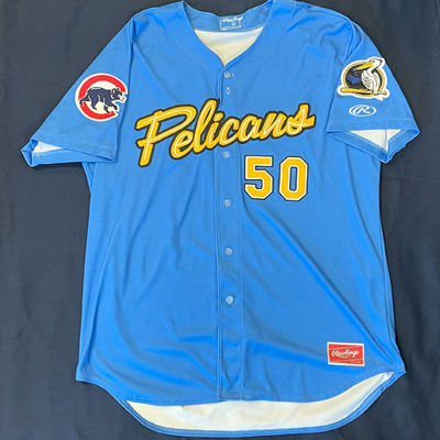 Myrtle Beach Pelicans 2019-2024 Alternate Blue #50 Size 52 Game Worn Jersey worn by Erling Moreno (2019), Brailyn Marquez (2023). Email dbailey@myrtlebeachpelicans.com to request player nameplate to be sent with jersey.