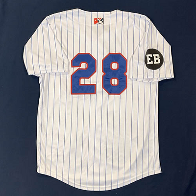 Myrtle Beach Pelicans 2015 LET'S PLAY TWO #28 Size 48 Clubhouse Issued Jersey. Worn during the 2nd Game of any Doubleheader during the 2nd Half of 2015 to celebrate Ernie Banks and his iconic "Let's Play Two" phrase. Worn by Tyler Skulina.