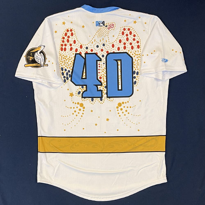 Myrtle Beach Pelicans 2018 Rhinestone Jumpsuit #40 Size 46 Clubhouse Issued Jersey for the 7/12/2018 Game, which was rained out. Jersey not worn in a game.
