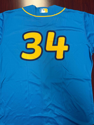 This jersey was unassigned during the Tulsa Drillers Noodlers Nights from Friday, July 18th to Sunday, July 21st 2025 at ONEOK Field. This jersey is #34 and is a size 48. Proceeds from this auction lot will help support the Tulsa Drillers Foundation.