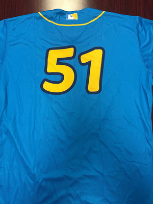 This jersey was unassigned during the Tulsa Drillers Noodlers Nights from Friday, July 18th to Sunday, July 21st 2025 at ONEOK Field. This jersey is #51 and is a size 52. Proceeds from this auction lot will help support the Tulsa Drillers Foundation.