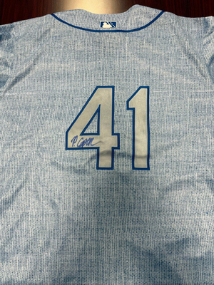 This jersey was signed and worn by pitcher, #41 Patrick Copen during the Tulsa Drillers Negro League Tribute Nights, honoring the "T" Town Clowns, from Thursday, June 19th to Saturday, June 21st 2025 at ONEOK Field. This jersey is a size 48 and proceeds will help revitalize the Historic Greenwood District known as Black Wall Street.